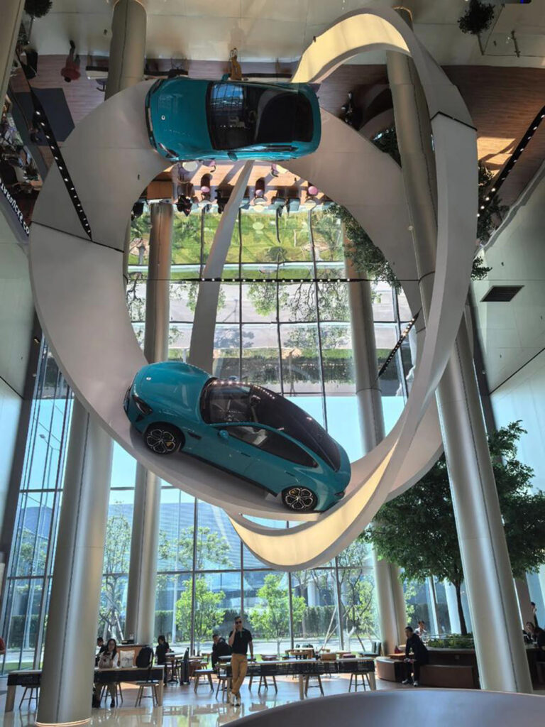 Following the guide, I navigated to the North 2 Gate of the factory in Yizhuang, Beijing. After parking my car, I walked to the Comprehensive Building and arrived at the check-in point in the building 10 minutes later. Hanging in the center of the lobby was a Möbius strip, under which a suspended Xiaomi SU7 was displayed quietly. Matched with the full-mirror ceiling, it exuded a strong sense of the future. After completing the registration, I received a visitor sticker and headphones, looking forward to the official start of this industrial and technological journey with great anticipation.