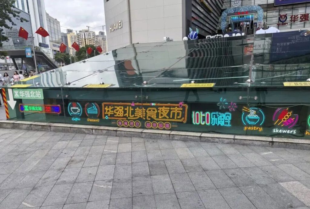 - As a street, it is a 70-meter-wide long thoroughfare, lined with iconic buildings such as Huaqiang Electronics World, SEG Plaza, Electronic Component Procurement Center, Window of the Modern World and Maoye Building on both sides;